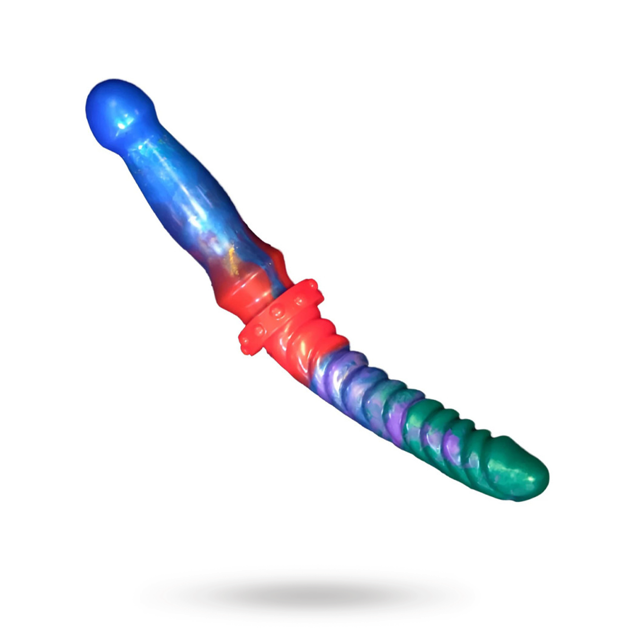 Upptäck Bluewy Double Dildo, en färgglad dubbeldildo med två olika ändar för maximal njutning – perfekt för både soloäventyr och lek med partner! Den ena sidan är texturerad med lätt räfflade strimmor och en rundad topp, medan den andra är slät med gradvis bredare form.